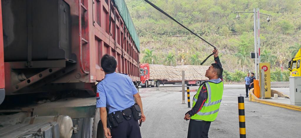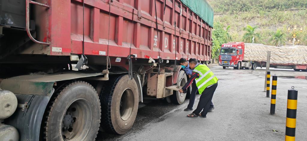 The police at the Hekou Exit-Entry Frontier Inspection Station are carefully inspecting the truck. Photographed by Pu Chao, a reporter from Xinhua News Agency