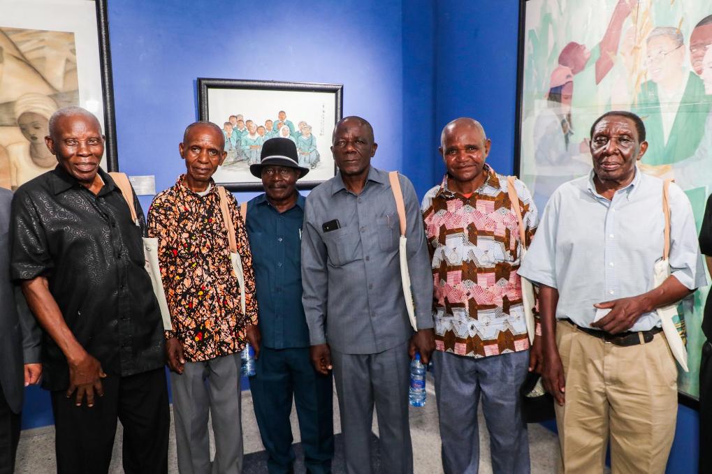 On November 26th, in Dar es Salaam, Tanzania, retired employees of the Tanzania Zambia Railway took a group photo at the "Friends on the Same Road - Tanzania Zambia Railway Painting Exhibition". Xinhua News Agency (Photo by Hermann Emanuel)